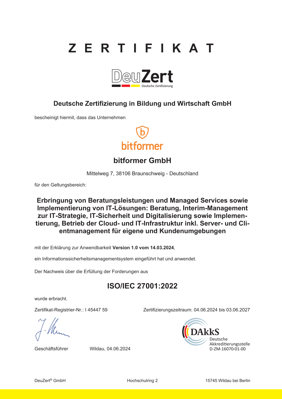Die ISO 27001 ist eine international gültige Norm für Informationssicherheitsmanagement, die Unternehmen befähigt, Risiken im Umgang mit IT-Systemen und sensiblen Daten systematisch zu erkennen und zu minimieren. Im Mittelpunkt steht der Schutz von Informationen vor unbefugtem Zugriff, Verlust oder Manipulation sowie die Sicherstellung eines zuverlässigen IT-Betriebs. Mit der ISO 27001-Zertifizierung zeigen Unternehmen, dass sie ein robustes Sicherheitsmanagement etabliert haben, das technische, organisatorische und personelle Maßnahmen umfasst. Die Norm bietet einen klar strukturierten Rahmen zur Entwicklung, Umsetzung und kontinuierlichen Verbesserung eines Informationssicherheits-Managementsystems (ISMS). Die erfolgreiche Zertifizierung stärkt die Vertrauensbasis zu Kunden und Partnern und unterstützt die sichere Gestaltung von IT-Strategien, Cloud-Lösungen und Digitalisierungsprozessen.
